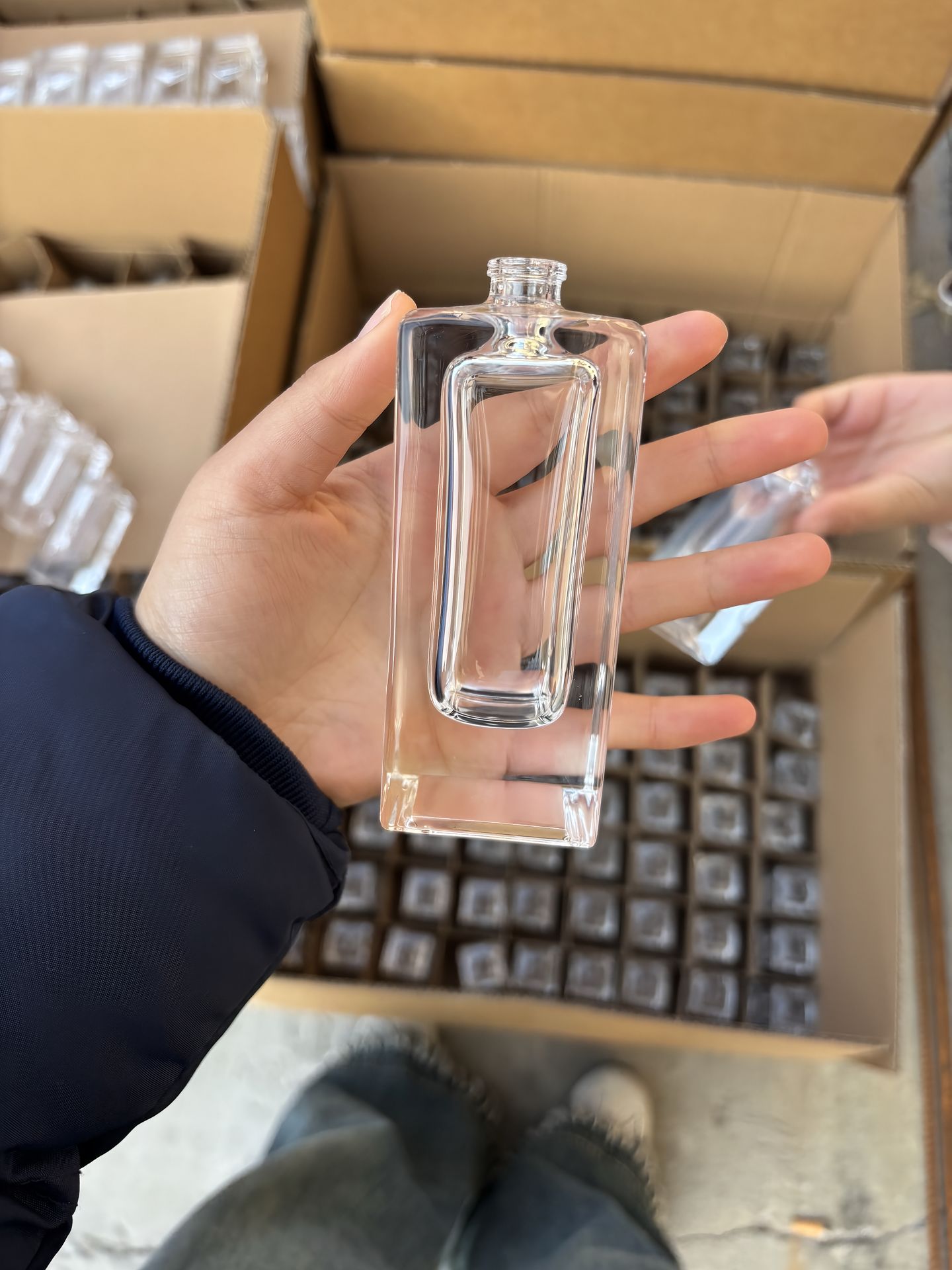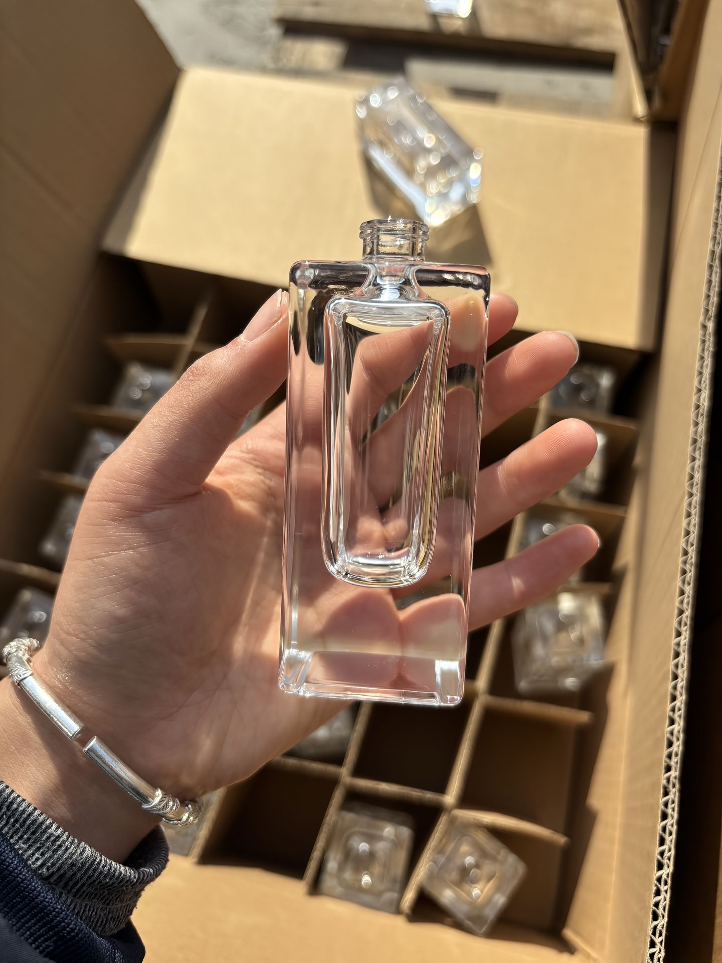 A crystal-clear glass perfume bottle, a custom order from a client.